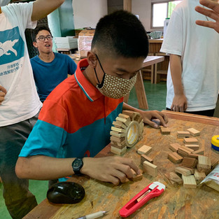 在模具的協助下同學們各自發展出不同的拱形,但抽掉模具時,常常撐起弧線的木塊就「嘩嘩」攤掉。於是,工頭要同學在弧線上下堆砌,可以增加穩定度。弧線穩定之後,還要置上重物確定結構穩固。